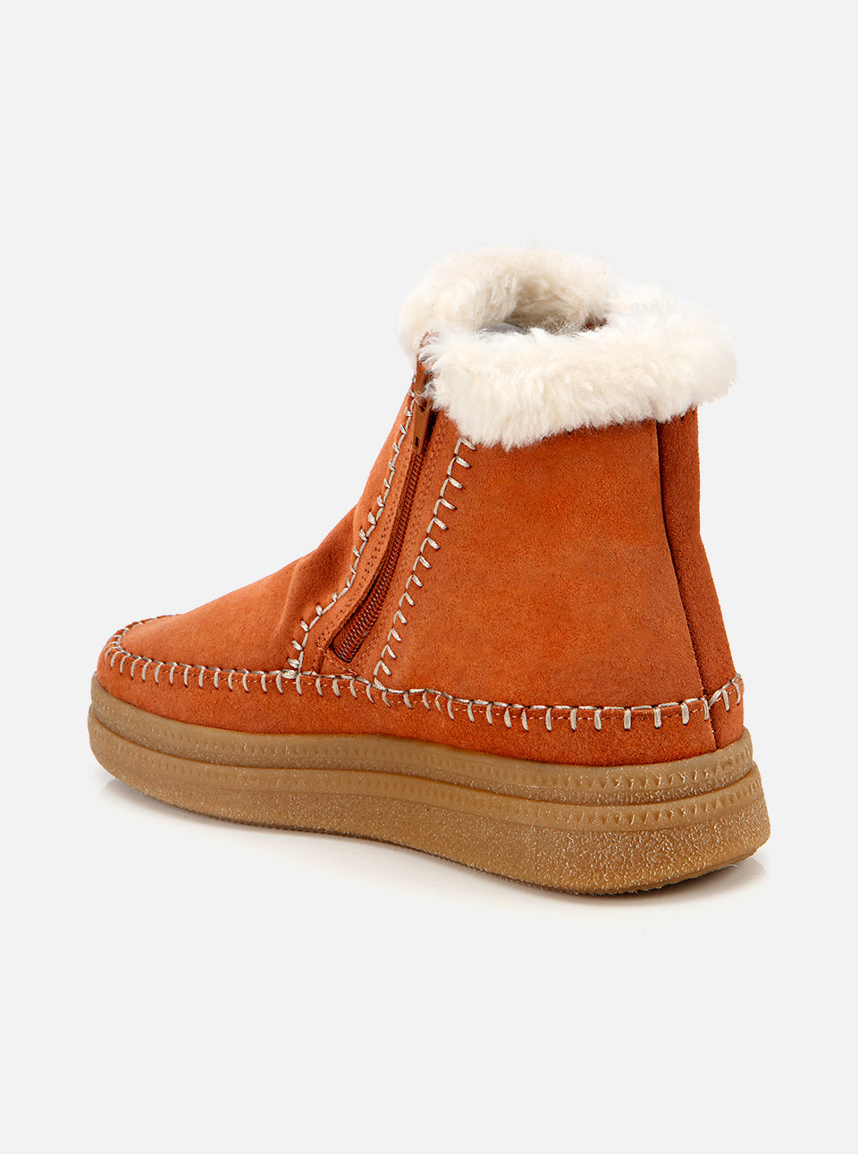 Yumuşak süet saya, kalın peluş astar, çift taraflı fermuar ve tığ işi detaylarıyla tamamlanıyor; soğuk geçirmeyen tabanıyla öne çıkıyor.