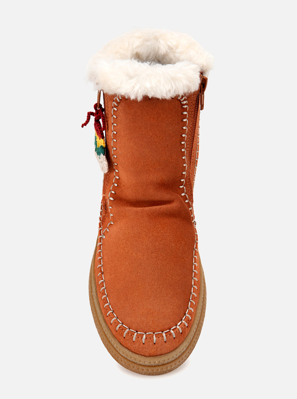 Kiremit rengi gerçek süet saraç dikişli Kadın elinden çıkmış tığ işi motifli detay imzalı peluş astarlı kışlık bot.