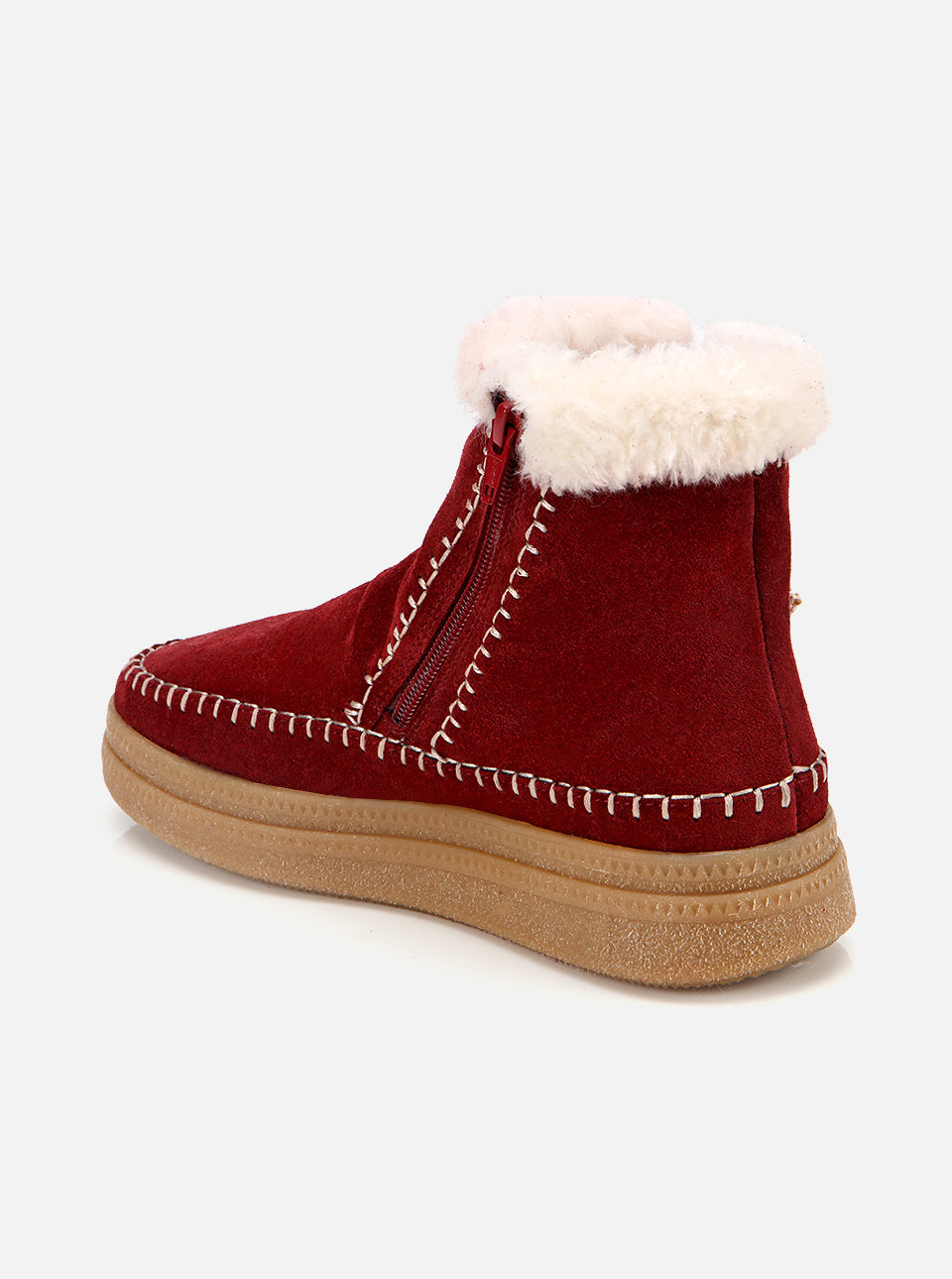 Yumuşak süet saya, kalın peluş astar, çift taraflı fermuar ve tığ işi detaylarıyla tamamlanıyor; soğuk geçirmeyen tabanıyla öne çıkıyor.