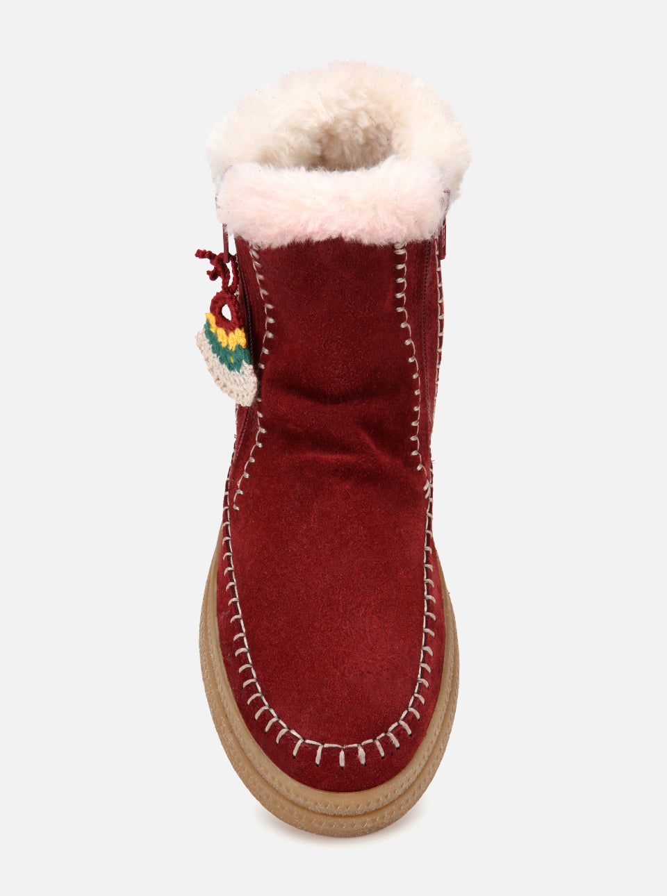 Bordo rengi gerçek süet saraç dikişli Kadın elinden çıkmış tığ işi motifli detay imzalı peluş astarlı kışlık bot.